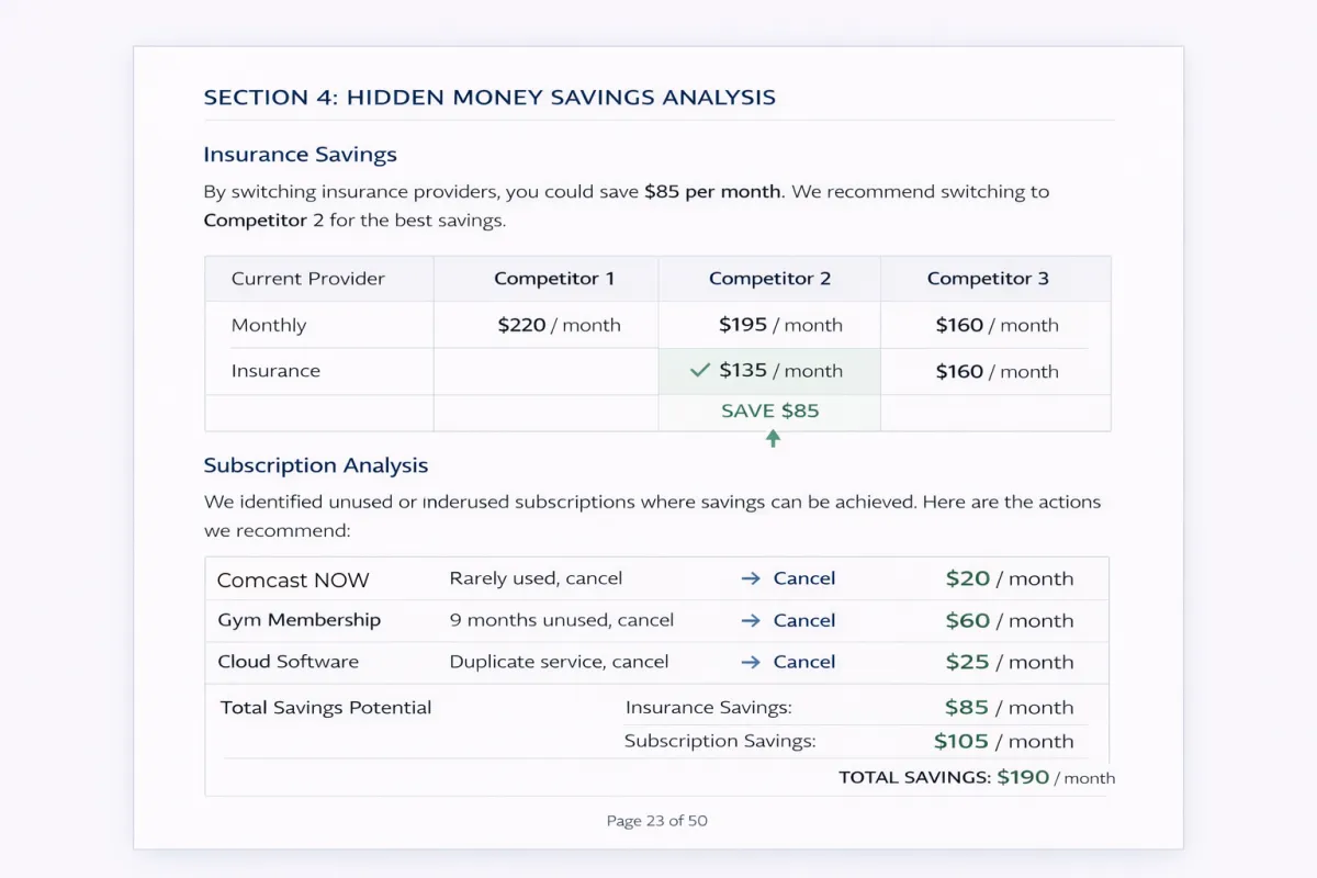 I'll tell you: "You're overpaying $230/month on auto and home insurance. Here are three competitors who'll save you that. Switch to this one. Here's the phone number. This takes 20 minutes."